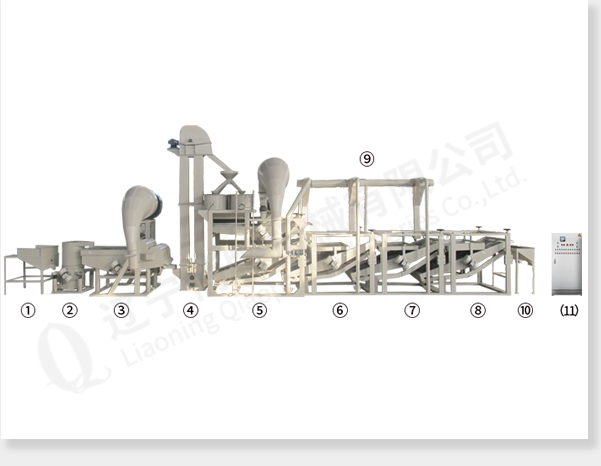 ① 上料斗② 原料提升机 ③ 多功能除杂机 ④ 斗式提升机 ⑤ 脱壳、风选、分选主机 ⑥ 籽仁复选机1 ⑦ 籽仁复选机2 ⑧ 籽仁复选机3 ⑨ 风力回料系统 ⑩ 接料斗 (11) 电气控制柜