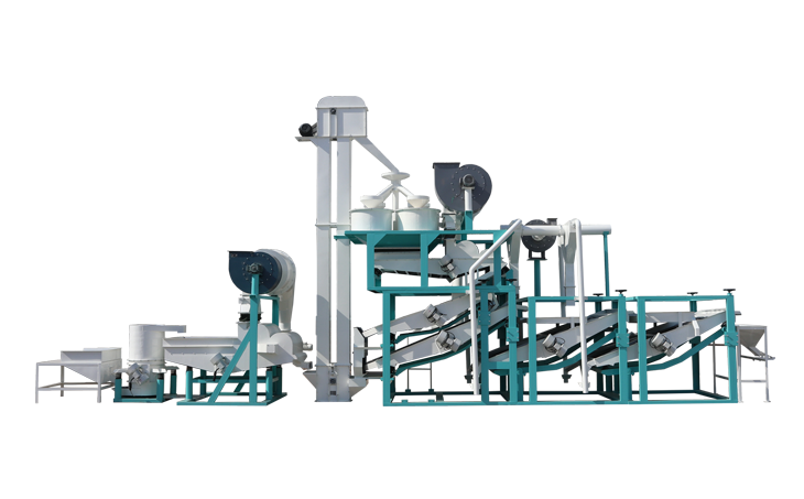 ① 上料斗② 斗式提升机 ③ 脱壳、风选、分选主机 ④ 籽仁复选机1 ⑤ 籽仁复选机2 ⑥ 风力回料系统 ⑦ 接料斗 ⑧ 电气控制柜